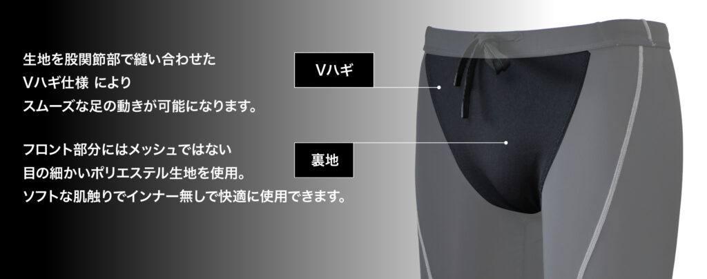 生地を股関節部で縫い合わせた Vハギ仕様 により、スムーズな足の動きを可能にします。
