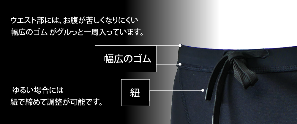 パンツの裏側には “幅広いウエストゴム”と“調整用の紐”